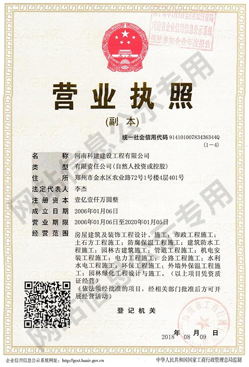 河南科建建設工程有限公司是一家以房屋建筑、建筑裝飾、建材貿易及大型建筑機械設備租賃為主營業務的成長型企業。擁有建筑工程總承包壹級資質,裝飾裝修、防水防腐保溫等專業承包壹級資質,注冊資本1.1億元。